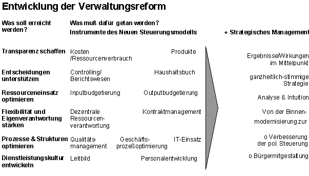 Verwaltungsreform: quo vadis?Dr. Rainer Heinz, Leiter des KGSt-Programmbereichs "Bürger, Politik und Verwaltung". Der Beitrag ist ein Vorabdruck für die Zeitschrift "SOCIALmanagement 3/2001" (Nomos Verlagsgesellschaft, Baden-Baden), die sich Anfang Mai 2001 schwerpunktmäßig mit dem Stand der Verwaltungsreform in Deutschland beschäftigt. 1991 - also vor fast zehn Jahren - veröffentlichte die KGSt ihren ersten Bericht zum so genannten Neuen Steuerungsmodell (Fußnote 1.) und löste damit und mit vielen weiteren Berichten eine bemerkenswerte Verwaltungsreform in Deutschland aus. Mittlerweile gibt es kaum noch Kommunen, die sich nicht zumindest auf den Weg machen. Bund und Länder ziehen mit zeitlicher Verzögerung nach. Ebenso sind bei vielen freien Trägern der sozialen Arbeit deutliche Veränderungen mit vielen Anleihen beim Neuen Steuerungsmodell zu beobachten. Was haben wir bislang erreicht? Allgemein lässt sich eine deutliche Leistungssteigerung der Kommunen feststellen. Für die Bürgerinnen und Bürger bedeutet dies: kürzere Wartezeiten, umfassendere Informationen, verständlichere Formulare, mehr Leistungen "aus einer Hand" u.v.m. Die Kommunen sind bürgerfreundlicher, wirtschaftlicher und effektiver geworden. Dies bestätigt eine Allensbach-Umfrage vom August 2000 (Fußnote 2.). Danach haben immerhin 41 % der Bevölkerung den Eindruck, dass sich die Ämter und Behörden tiefgreifend verändern und von staatlichen Bürokratien zu modernen Dienstleistern entwickeln. Dies gilt besonders für die Kommunen. Nur ein Drittel der Bevölkerung sieht die Kommunen heute noch primär als staatliche Bürokratie. Für 59 % sind die Kommunen auch oder sogar primär Dienstleister im Interesse der Bürgerinnen und Bürger. Insbesondere jene Personen, die häufiger Kontakt mit Ämtern haben, stellen einen verbesserten Service fest. 46 % sagen: "Es ging alles sehr schnell und unkompliziert." Aber mit der Verwaltungsreform ist es wie im "richtigen Leben": Mit klarer Analyse, festem Willen und ausreichenden Anstrengungen kann man viel erreichen; aber nicht immer alles, was man wollte und oft langsamer als man hoffte. Auch sind die Erfolge von Ort zu Ort sehr unterschiedlich. Noch keine Kommune in Deutschland hat die Potenziale der Verwaltungsreform ausgeschöpft. Deshalb lohnt sich ein "vorausschauender Rückblick". Positiv fällt zunächst das veränderte Selbstverständnis auf. Das Leitbild eines mit den Bürgern intensiv kommunizierenden und kooperierenden Dienst- und Gewährleisters ist nach anfänglicher Skepsis eine Selbstverständlichkeit. Ein Grund ist, dass viele Mitarbeiterinnen und Mitarbeiter die Defizite klassisch-bürokratischer Verwaltungen sowohl aus interner Sicht als auch in ihrer Rolle als Bürger und/oder "Kunde der Verwaltungen" seit langem kritisieren. Im Jugendbereich kam hinzu, dass das zeitgleich in Kraft getretende Kinder- und Jugendhilfegesetz (KJHG) ebenfalls mit veralteten Rollenbildern aus dem Jugendwohlfahrtsgesetz (JWG) abschloss und neue, angemessene Formen der Leistungen sowie der Kommunikation und Kooperation einforderte. Mit einem "modernen" Leitbild ist es aber nicht getan. Es ist Anspruch und Aufforderung zur Veränderung und nicht Selbstzweck (Fußnote 3.). Wenn relevante Teile der Mitarbeiterschaft daher in einer Kommune den Eindruck haben, es habe sich faktisch zu wenig verändert, ist dies sehr ernst zu nehmen. Ein wesentlicher Veränderungsschwerpunkt des Neuen Steuerungsmodells ist die Entwicklung und Einführung professioneller Managementinstrumente. Hier sind ohne Zweifel die größten Fortschritte gemacht worden. Produktbeschreibungen, Kosten- und Leistungsrechnung in Verbindung mit einem verbesserten Haushalts- und Rechnungswesen sowie Controlling, Berichtswesen und Kontraktmanagement als Teile eines breiten Reformprozesses haben
